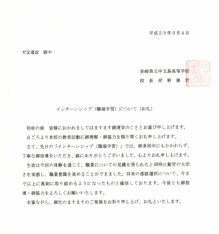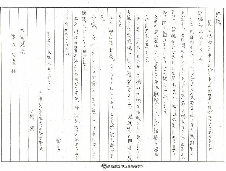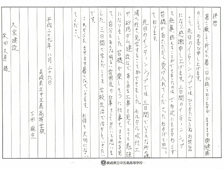 中五島高校河野校長先生、下田君・中村君・平山君からお礼のメッセージをいただきました。