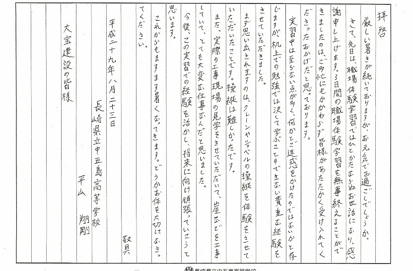 8月21日から3日間、中五島高校1年生3名が大宝建設㈱3現場で体験を実施しました。