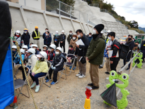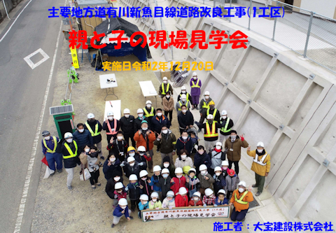 主要地方道有川新魚目線道路改良工事において親と子の現場見学会を開催しました。魚目小学校の児童と保護者を中心に、当初の予定の倍近く48名が参加してくれました。