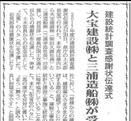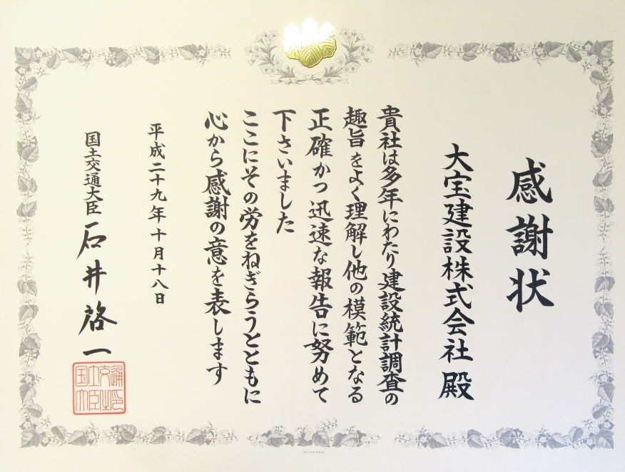 平成29年11月 国土交通省より建設統計調査感謝状を頂きました