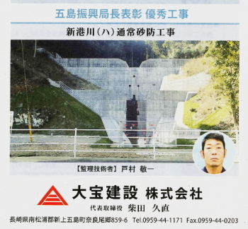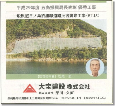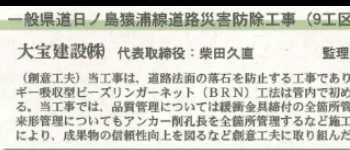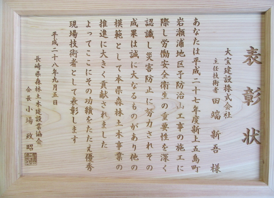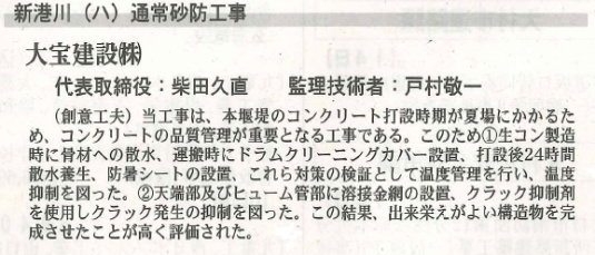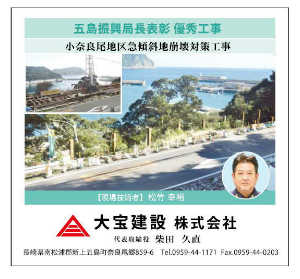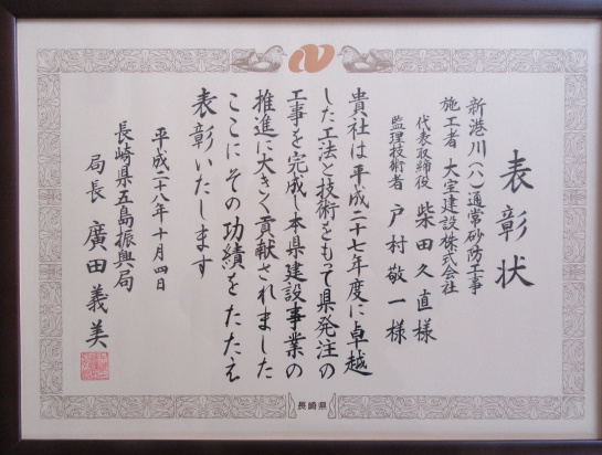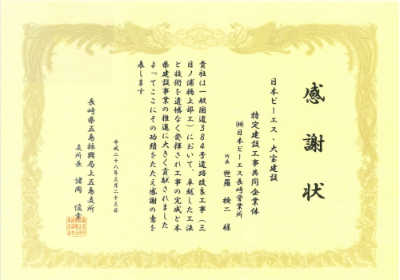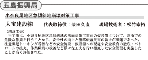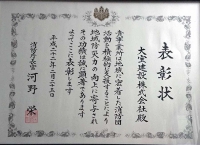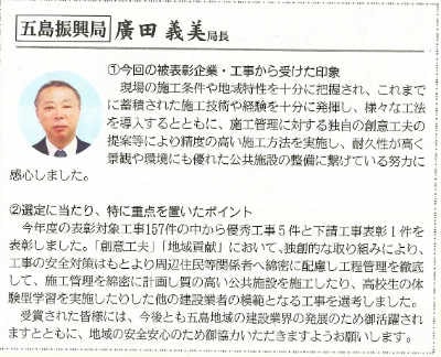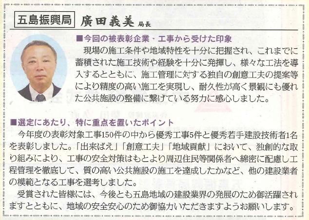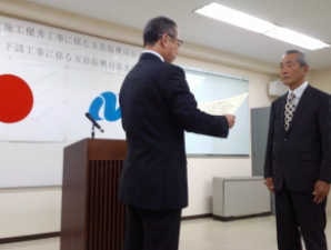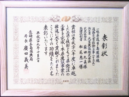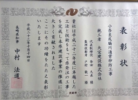 本県発注の一般国道384号道路改良工事を卓越した工法と技術をもって完成し建設業の推進に大きく貢献したことが評価されました