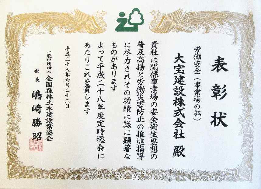 安全衛生の重要性を深く認識した多年にわたり積極的に労働災害防止活動が評価されました