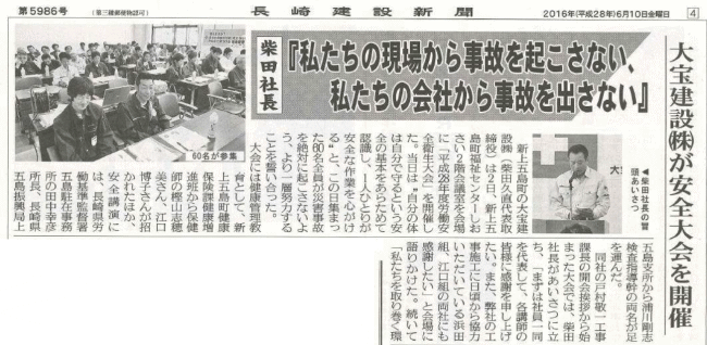 長崎県労働基準監督署五島駐在事務所 所長 田中幸彦様、長崎県五島振興局上五島支所検査指導幹 浦川剛志様をお招きしご講壇いただき、安全についての意識向上と社内優秀工事表彰を行いました。